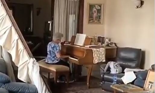 Un'anziana signora suona al pianoforte nella sua casa devastata.