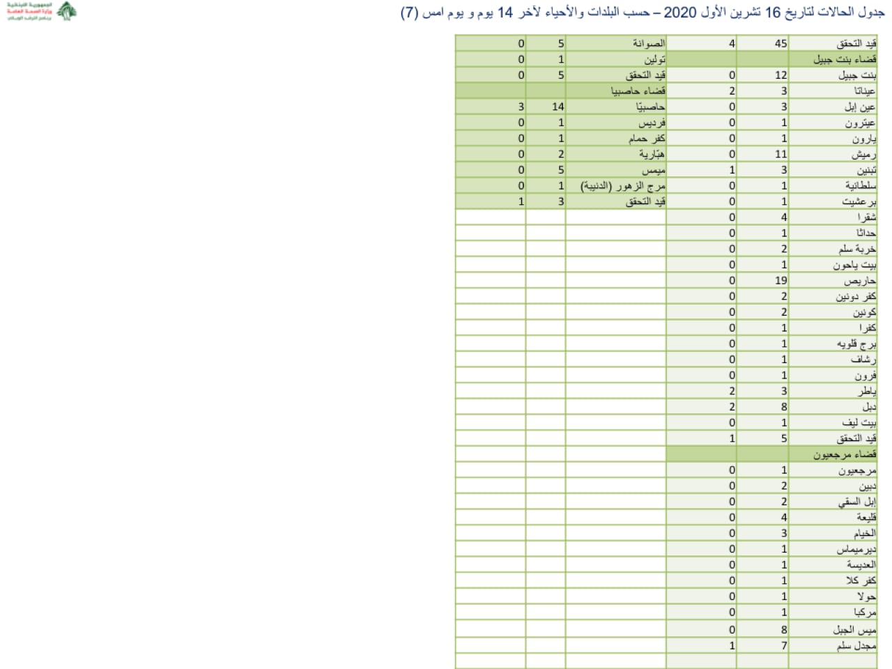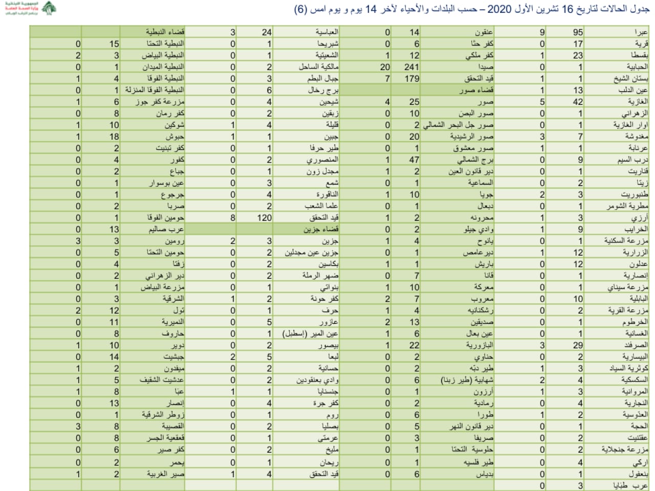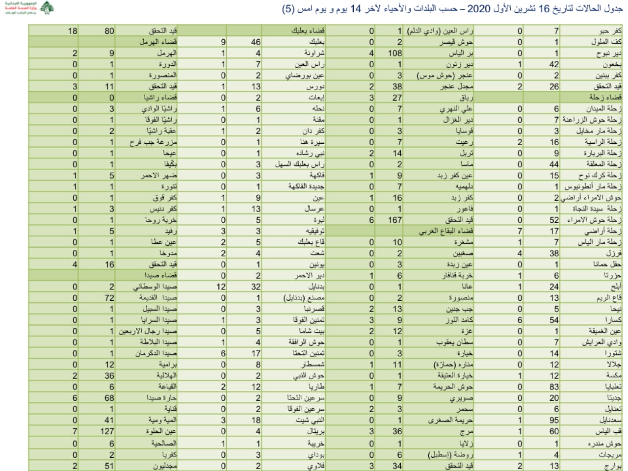 نشرت وزارة الصحة جدول توزيع الإصابات الجديدة بفيروس كورونا.