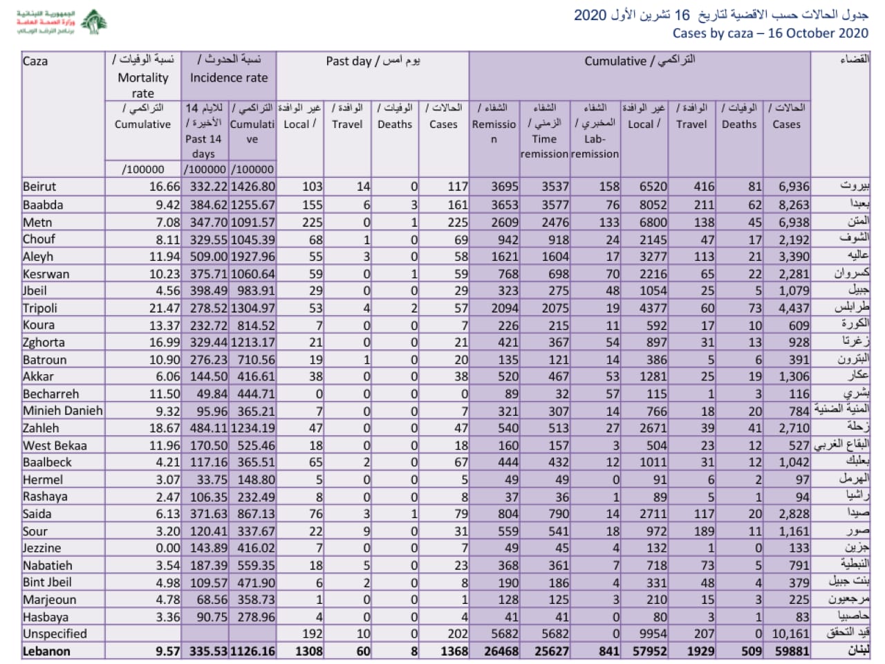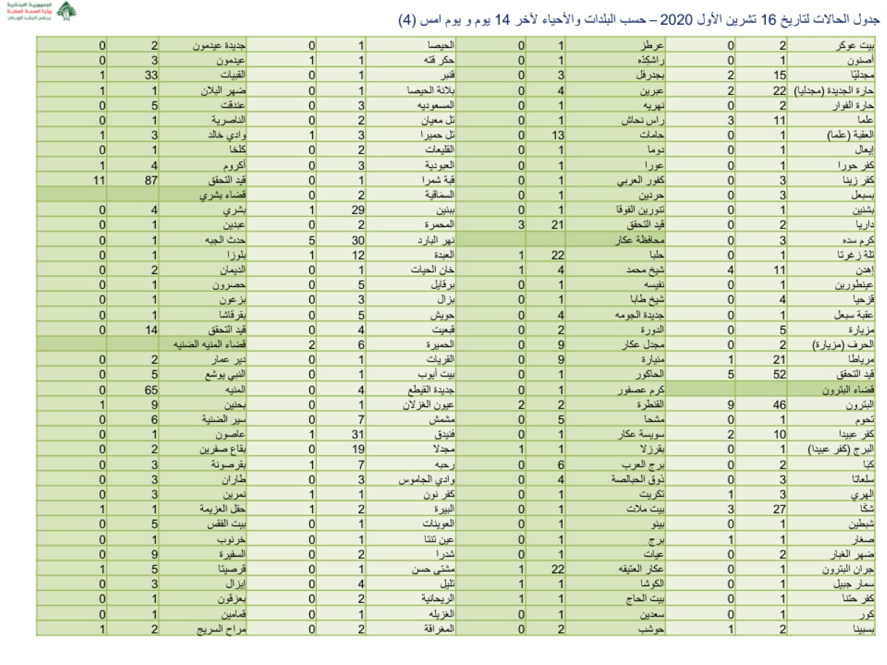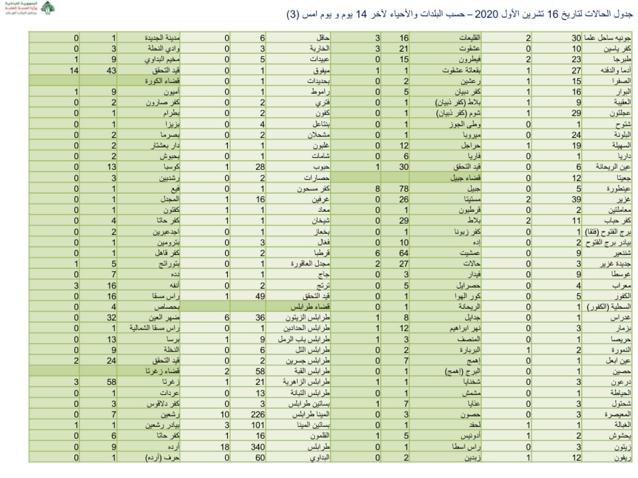 نشرت وزارة الصحة جدول توزيع الإصابات الجديدة بفيروس كورونا.