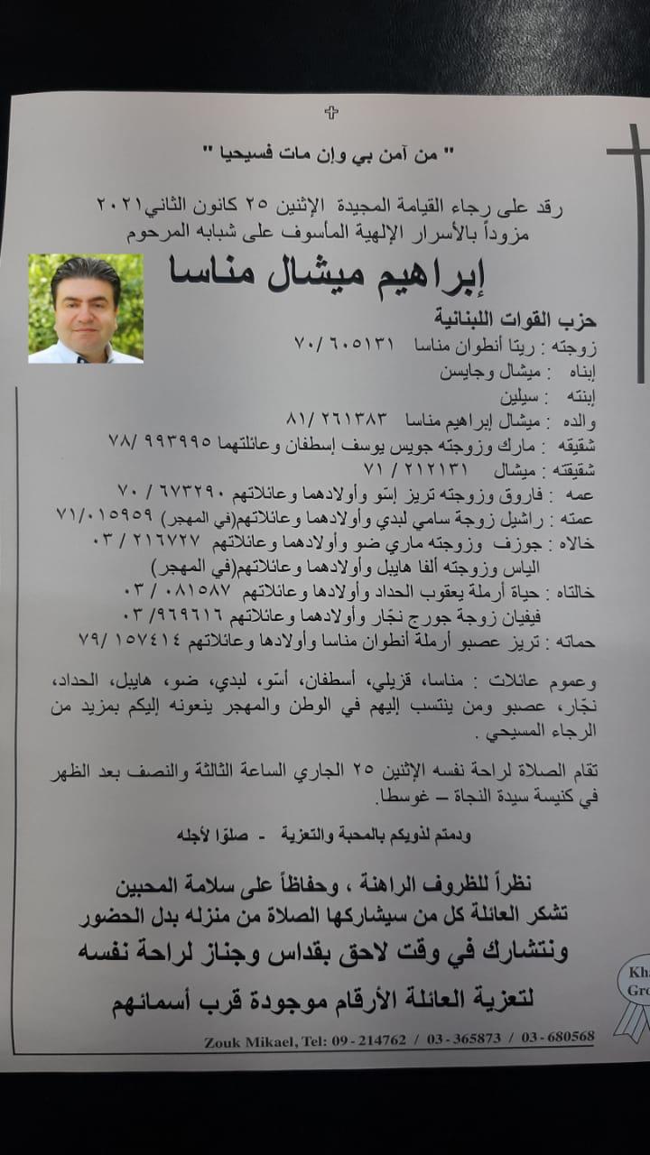 تودع غوسطا ابراهيم مناسا رئيس مكتب القوات اللبنانية في غوسطا وذلك بعد مضاعفات إثر إصـ ـابته بكـ ـورونـ ـا.