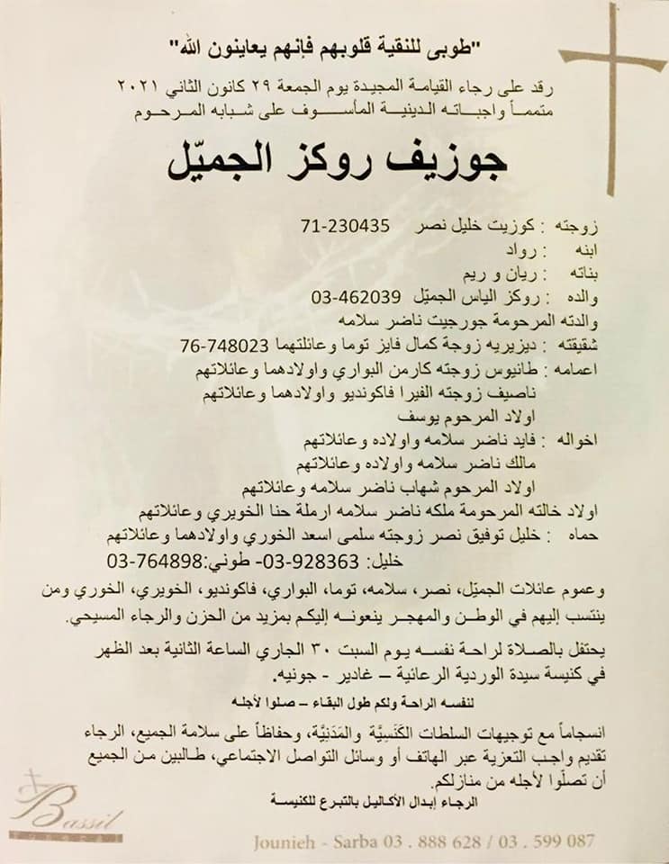 يرحـ ـل صاحب النخوة والمندفع الى الخدمة في ظروف تحتاج منطقتنا الى امثاله. بابتسامته المعهودة وبابه المفتوح امام الجميع دون استثناء يرحل جوزيف الى دنيا الحق لينضم الى الابرار والصديقين حيث اهل الخير.خدم رعيته وابناء رعيته بحب واخلاص وأبـ ـكى كل من عرفه على رحـ ـيله المفاجئ.
