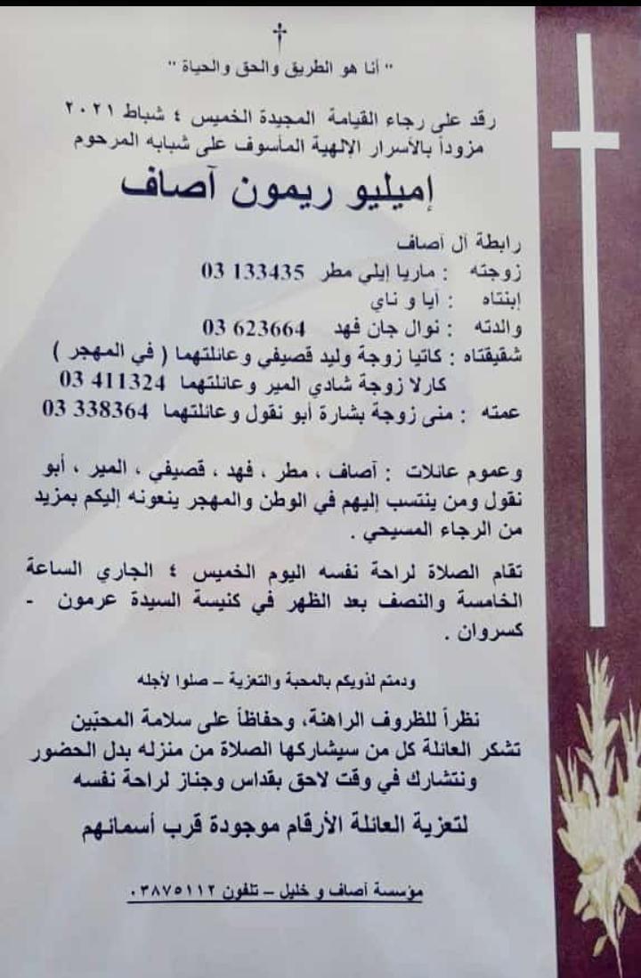 خـ ـطـ ـف المـ ـوت الشاب ايميليو آصاف ابن بلدة عرمون كسروان والمقيم في غزير حيث عمله. غـ ـدره كـ ـورونـ ـا ليترك صغيرتيه آيا ونايا بأيد أمينة مع الزوجة المحبة ماريا.