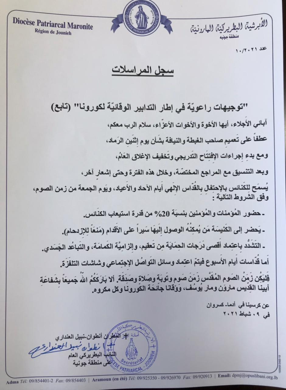 قرار صادر عن أبرشية جونية المارونية … الكنائس ستفتح أبوابها في هذه الأيام بواسطة imanouna imanouna تماشيا مع قرار البطريركية المارونية حول إعادة فتح الكنائس، أصدرت أبرشية جونية المارونية قرارا يسمح بإقامة بالقداديس الإلهية أيام الآحاد والأعياد، ونهار الجمعة من زمن الصوم. إليكم القرار: