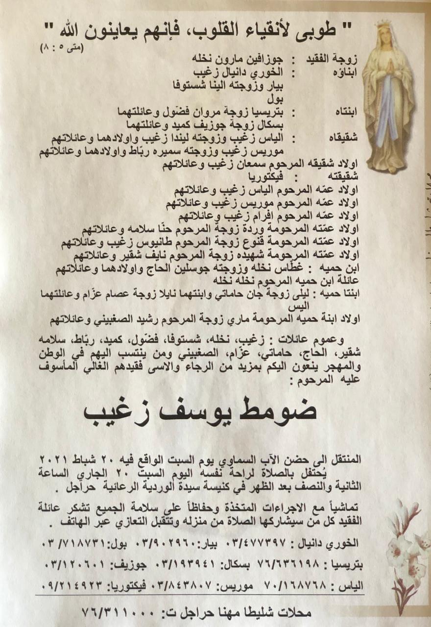 توفي ضومط زغيب والد الخوري دانيال زغيب كاهن رعية حراجل .