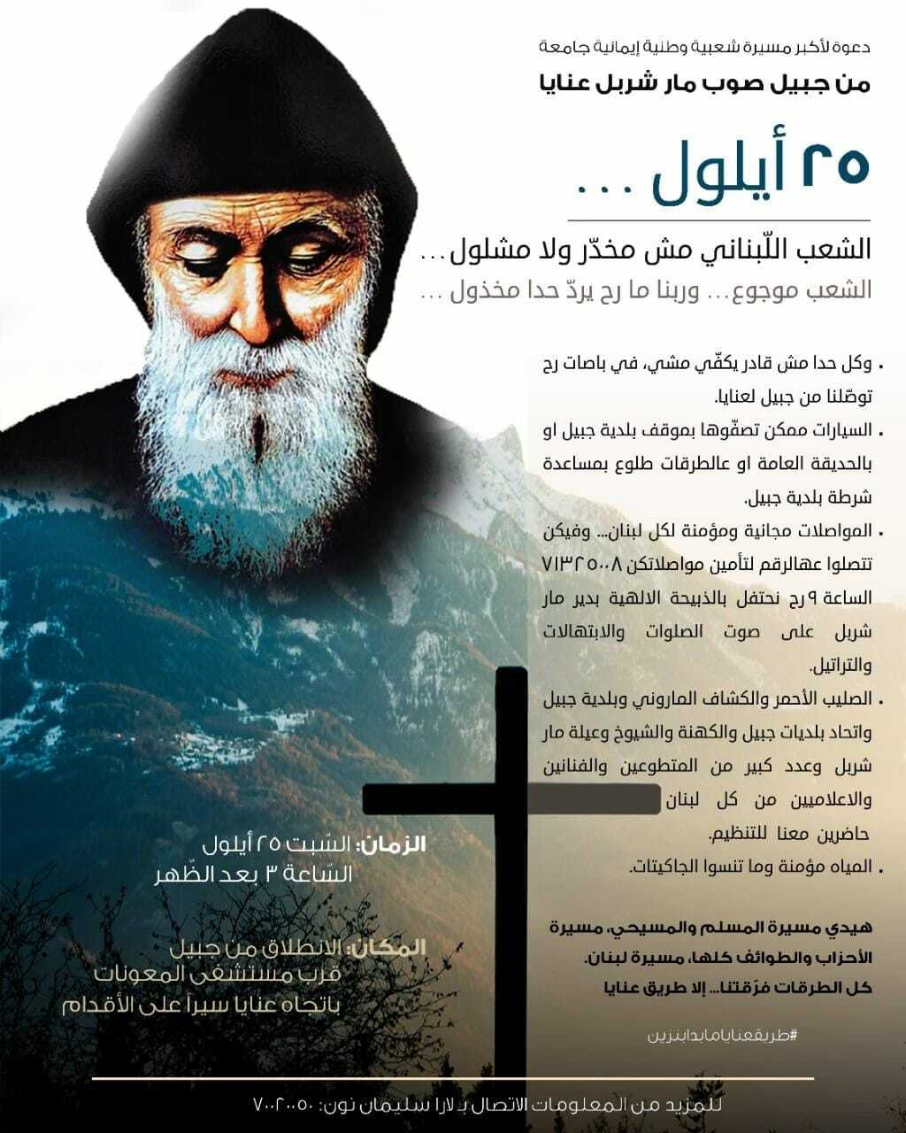 ٢٥ أيلول ٢٠٢١ يوم صلاة عالميّ من أجل لبنان ، من الولايات المتحدة، البرتغال ،أستراليا،الأردن وغيرها من البلدان، سيشاركون في المسيرة الشعبية الجامعة نحو القديس شربل في عنايا.